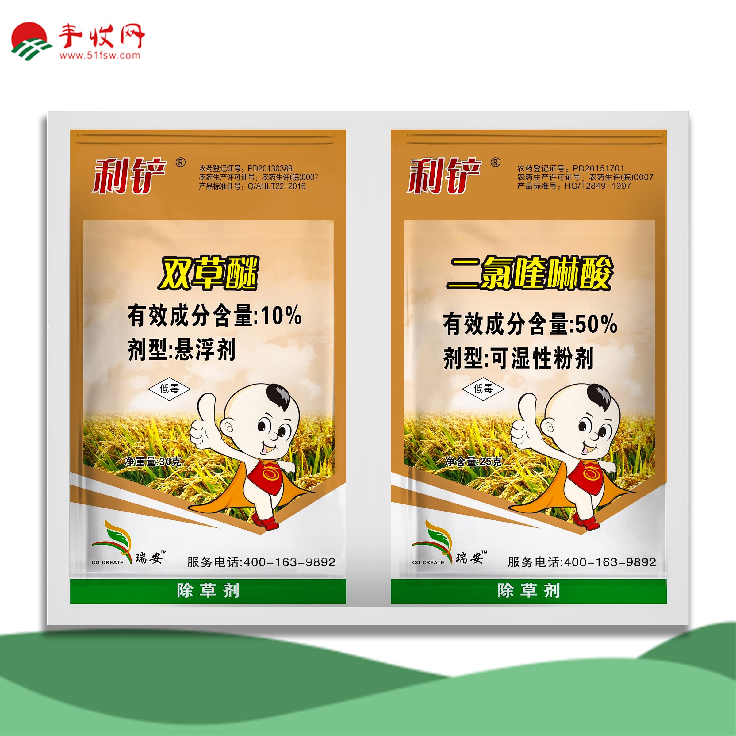 利铲10%双草醚+50%二氯喹啉酸钠盐。水稻田抗性杂草特效,如稗草、双穗雀稗、稻李氏禾、马唐、牛筋草等,兼治阔叶、莎草。